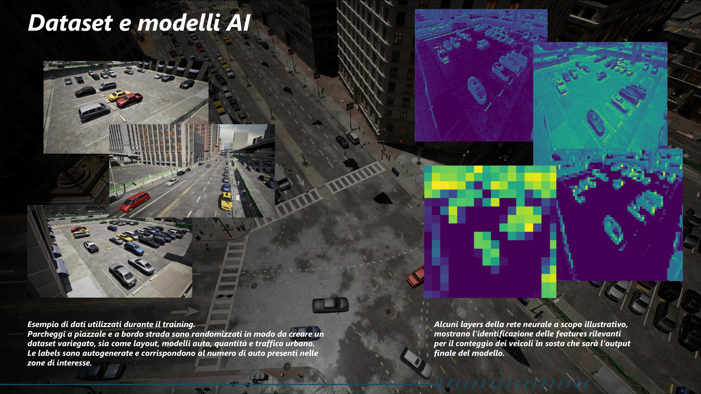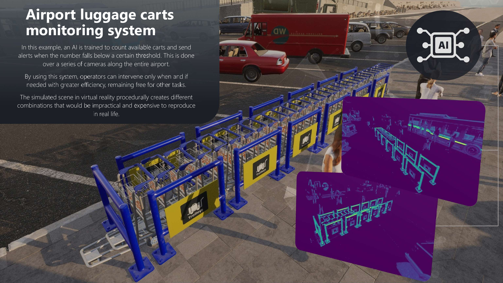 In the case exposed, we setup a scene that procedurally randomize cars, people and number of trolleys. Position and orientation are jittered to avoid repetitive scenes.